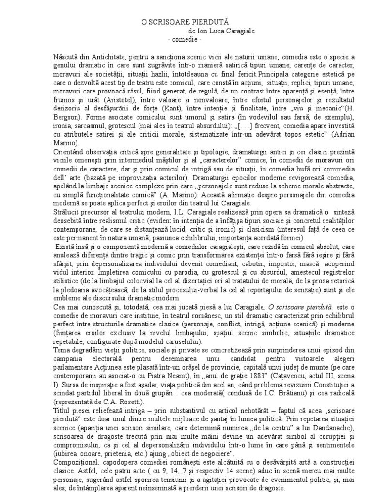 Comentariul operei o scrisoare pierduta de i.l. Comedie de ion luca caragiale. It premiered in 1884, and arguably represents the high point of his career.