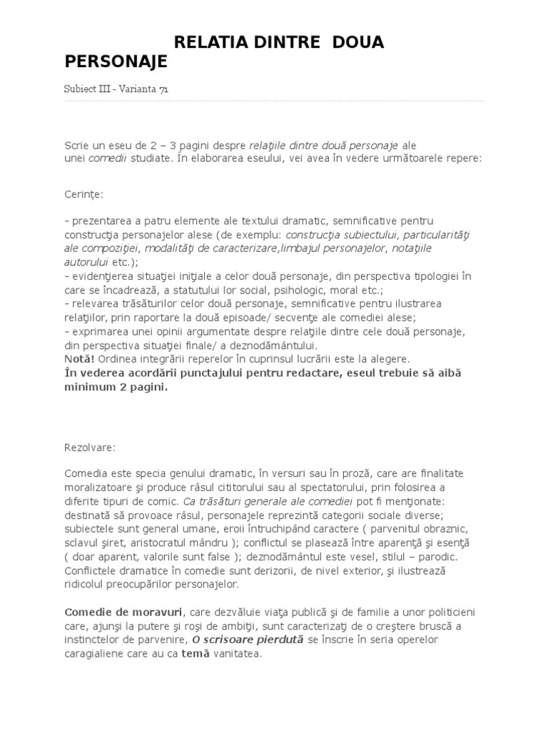 Relatia dintre 2 personaje din enigma otilie. „relația dintre două personaje reprezintă una dintre cele mai des întâlnite cerințe pentru subiectul iii de la bacalaureatul la limba și literatura română. Basmul cult este o specie narativa ampla, cu numeroase personaje purtatoare ale unor valori simbolice, cu actiune implicand supranaturalul si supusa unor actiuni conventionale, care infatiseaza parcurgerea drumului maturizarii de catre erou.