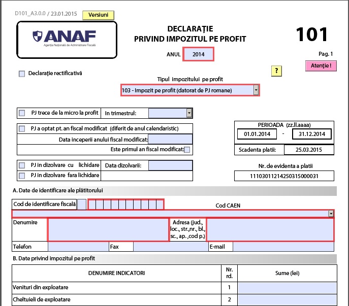 vizitati articolul complet aici : https://www.contexpert-az.ro/declaratia-101/ Până pe 30 aprilie a anului următor, se depune bilanțul. Soft j* actualizat în data de 28.01.2020. Daca trec cheltuielile pe rd 32 imi da de plata impozit de 5826.